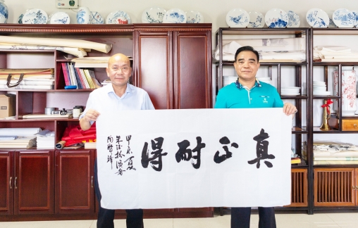 7月30日,國家一級特型演員、朱德總司令扮演者陶賢鋒大校(陶辛鎮(zhèn)友誼村人),來到故鄉(xiāng)蕪湖市灣沚區(qū),走進蕪湖耐得膠管閥業(yè)有限公司與企業(yè)和詩書畫學會部分藝術愛好者進行座談交流。座談期間氣氛歡快愉悅,大家暢所欲言。應大家誠摯邀請,陶賢鋒大校揮毫潑墨,現場書寫并贈送了“丹青逐夢送輝煌,翰墨禮贊新時代”、“真正耐得”等書法作品。